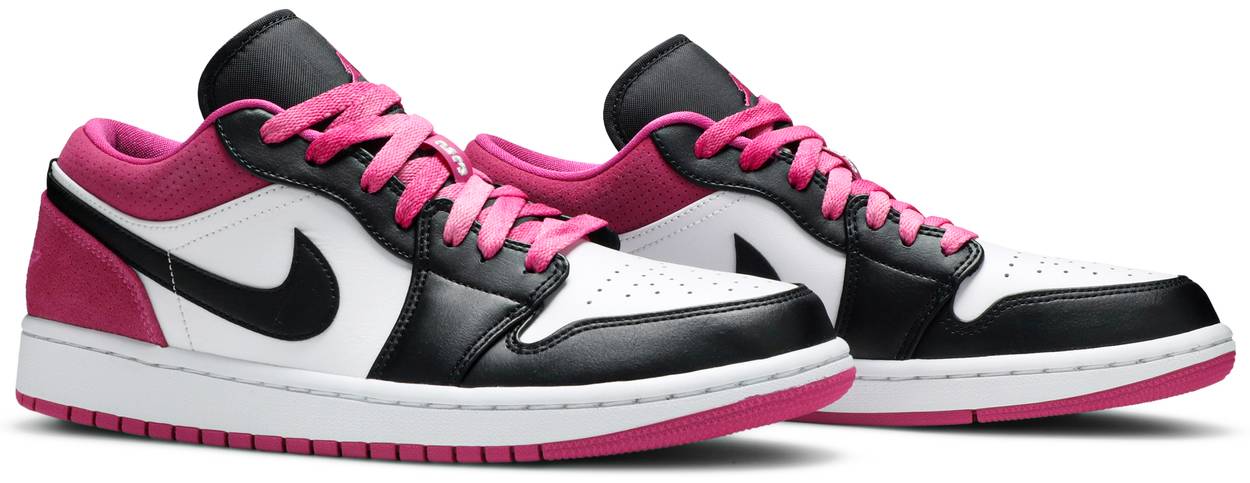 The Air Jordan 1 Low SE ‘Fuchsia’ showcases classic color blocking that recalls the ‘Black Toe’ edition of the sneaker’s full-height counterpart. The upper uses a white leather base with contrasting black leather overlays and a matching black Nike Swoosh. Perforated suede in Active Fuchsia is applied to the padded collar and heel, the latter embroidered with a Jordan Wings logo. Jumpman branding on the black nylon tongue is similarly rendered in fuchsia.