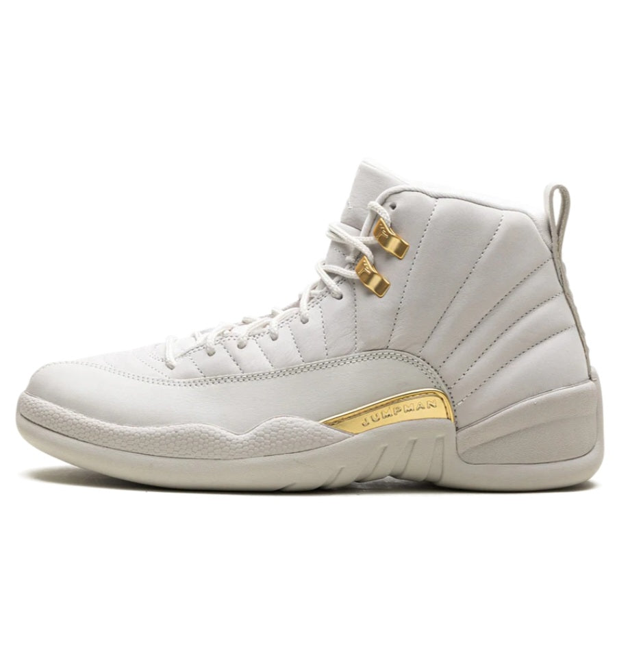 The Women's Air Jordan 12 Retro 'Phantom' features an ivory-colored leather upper, accented with radiating stitched lines and bolstered with a lizard-textured mudguard. The upper eyelets are finished in metallic gold, matching the TPU midfoot overlay. Jumpman branding embellishes the tongue and heel tab. The legacy silhouette's performance benefits include a carbon fiber shank plate and a Phylon midsole with full-length Zoom Air cushioning. Underfoot, the outsole is equipped with herringbone traction pods for optimal grip.