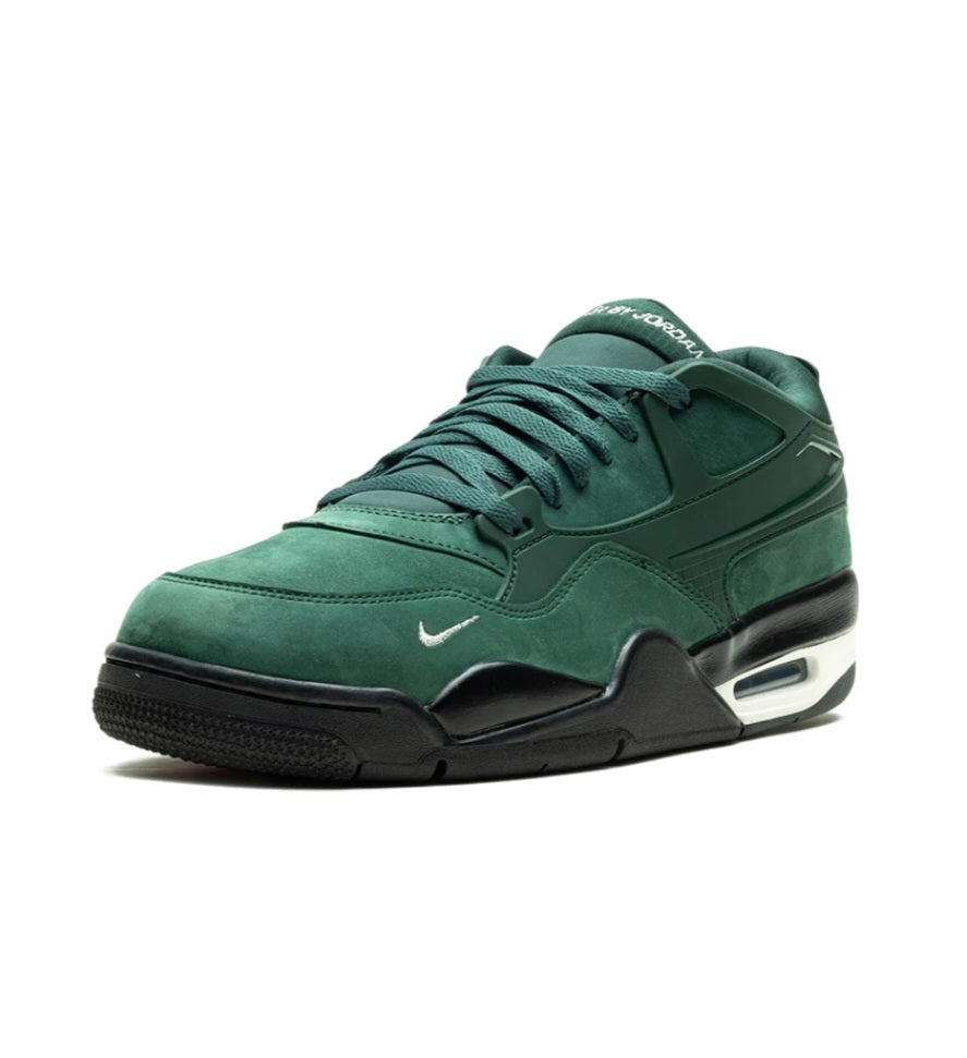 The Nigel Sylvester x Air Jordan 4 RM SP 'Grandma's Driveway - Fence Green' debuts the BMX star's refreshed take on Michael Jordan's fourth signature model. A dark emerald hue suffuses the upper, crafted from suede with a supportive TPU cage. A white mini-Swoosh is embroidered on the lateral forefoot, while 'Bike Air by Jordan' is inscribed on the tongue. An embossed Bike Air logo decorates the back heel. The sneaker sits atop a two-tone AJ4 midsole, finished in black and off-white tones and augmented with visible Air-sole cushioning.