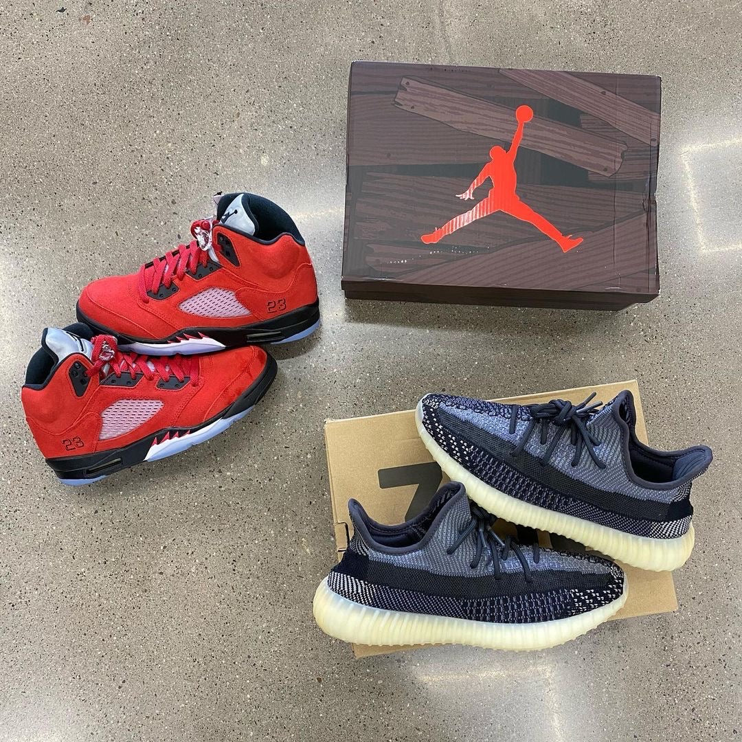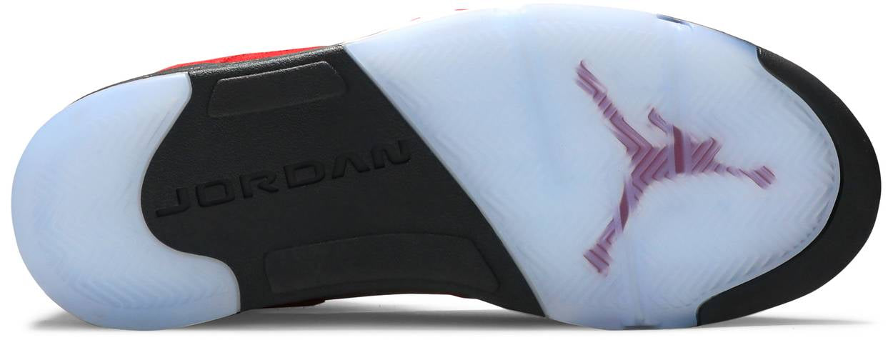 The 2021 reissue of the Air Jordan 5 Retro ‘Raging Bull’ brings back a beloved colorway originally released as one-half of 2009’s Air Jordan 5 Raging Bulls Pack. The shoe’s defining feature is a plush Varsity Red suede upper, equipped with black eyelets and a Jumpman-branded reflective silver tongue. The heel overlay displays a second Jumpman logo and an embroidered 23 on the lateral side. A visible Nike Air heel unit enhances the polyurethane midsole, accented with red-tipped shark tooth detailing and supported by an icy translucent outsole.