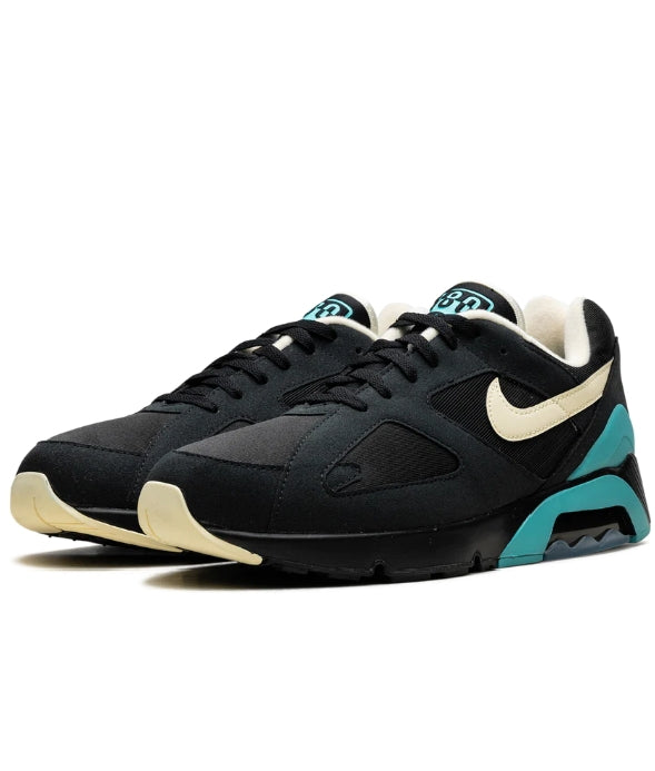 The Nike Air Max 180 'Black Dusty Cactus' showcases a cream-colored leather Swoosh across a black textile upper, bolstered with tonal suede overlays and a TPU heel counter in a bright teal finish. The latter hue is repeated on the 180 Air tongue tag and the Nike Air logo embroidered on the back heel. The sneaker rests on a solid black polyurethane midsole, contrasted by a teal frame surrounding the revolutionary 180-degree Air Max unit.