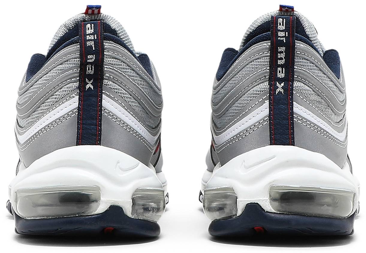 The sneaker itself is a rework of the original “Silver Bullet” Air Max 97 colorway. It features a silver reflective and mesh with the model’s signature radial lines and adds the Puerto Rican flag to the tongue loop as well as the outsole. It also appears that the sneaker will swap its traditional black accents for a dark navy blue.