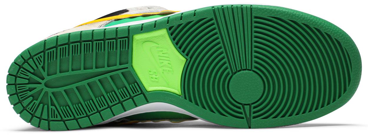 Made in collaboration with Ben & Jerry’s, the Nike Dunk Low SB ‘Chunky Dunky’ replicates the packaging used for the ice cream brand’s Chunky Monkey flavor. The leather upper depicts blue skies and green pastures, while pony-hair overlays are rendered in a spotted cow print. A yellow leather Swoosh is treated to a melting ice cream effect for added visual flair. Atop the tongue, the woven tag features a Chunky Dunky callout alongside Nike SB branding.