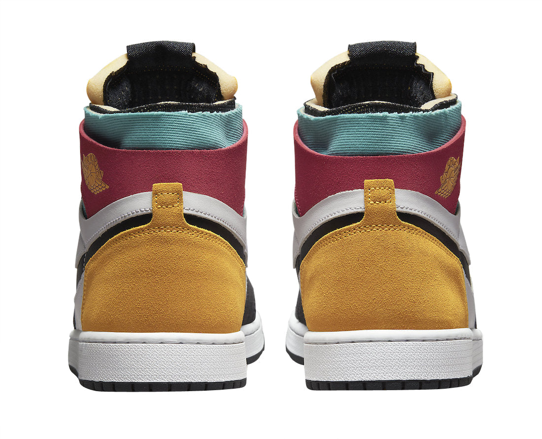 Official images of the Air Jordan 1 Zoom Comfort Multicolor show that it starts off with the classic “Black Toe” color blocking in the front, which is then highlighted by the multicolored accents on the tongue, collar, ankle and heel region. Constructed in a mix of leather and suede overlays, other details include the mesh collars, the trim outsole, the Zoom Air branded padded tongues and insoles, and the model’s signature cut-out Swooshes.