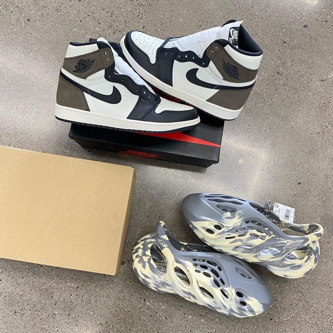 The Air Jordan 1 Retro High OG ‘Dark Mocha’ features a distinctive palette that calls to mind Travis Scott’s highly coveted Air Jordan 1 collaboration from 2019. The upper features an off-white leather base with contrasting black leather overlays on the eyestay and toe. Brown nubuck is utilized on the heel overlay and collar flap, accented with a classic Wings logo on the lateral side. A leather tag with Nike Air branding adorns the nylon tongue.