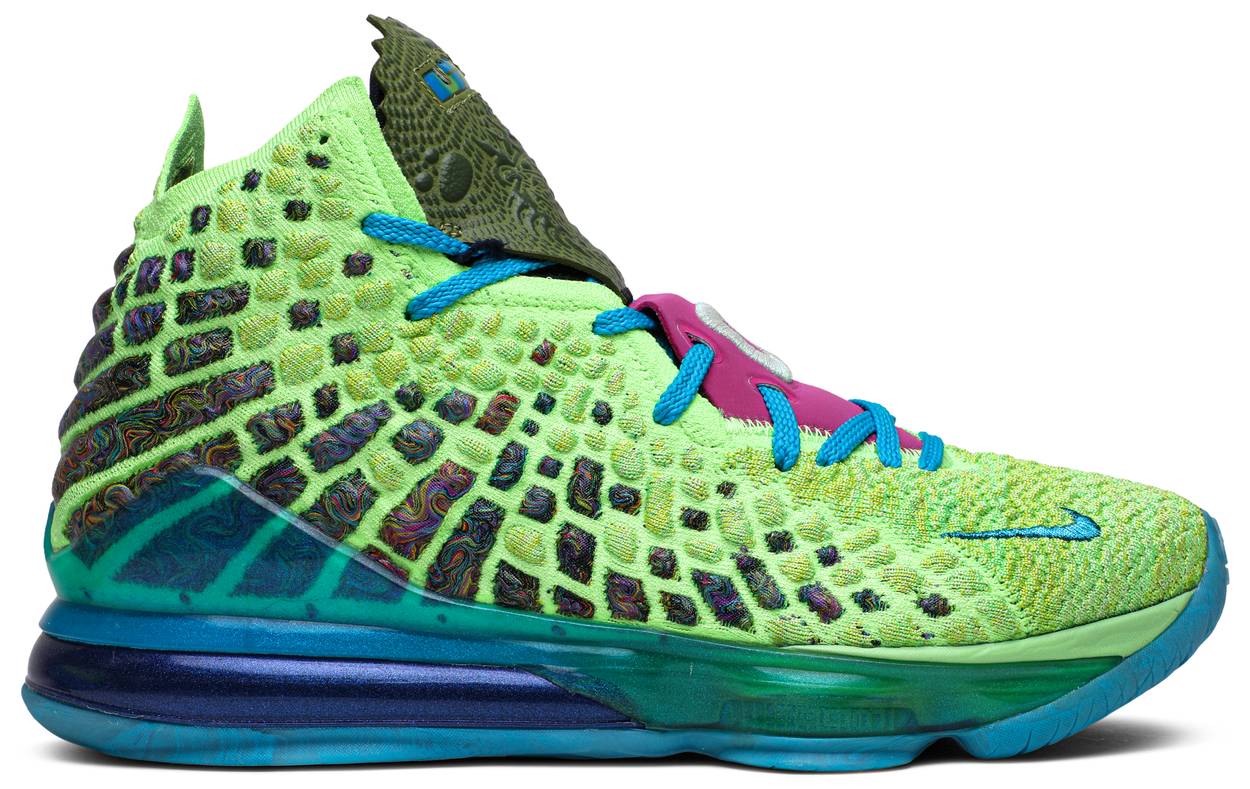 Debuting on the feet of King James during the second half of the 2020 NBA All-Star Game, the LeBron 17 ‘Mr. Swackhammer’ gets its name from the cartoon villain of ‘Space Jam.’ The character’s green alien skin is replicated on the sneaker’s Knitposite upper, as well as the scaly reptilian tongue that bears LeBron’s personal logo. Swackhammer’s purple suit, meanwhile, is referenced on the lace cover and visible Max Air unit underneath the heel.