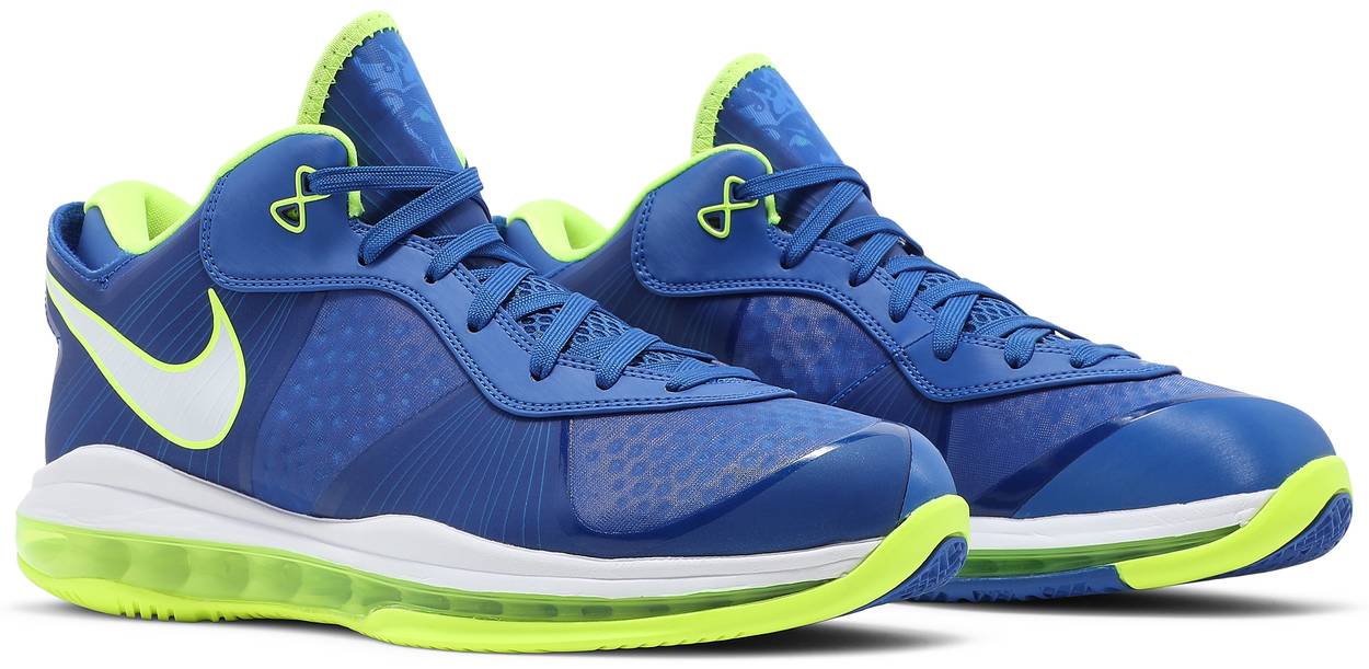 The 2021 edition of the Nike LeBron 8 V/2 Low ‘Sprite’ brings back the lively colorway a decade after its original release. Unofficially named after the soda brand endorsed by LeBron James, the sneaker rides on a buoyant Max Air 360 unit in Volt green. The neon hue is repeated on the rubber outsole, collar lining and upper eyelets. The synthetic upper is rendered in a bold Treasure Blue finish, featuring embedded Flywire support and a contrasting white Swoosh that ends on a spoiler-like heel loop.