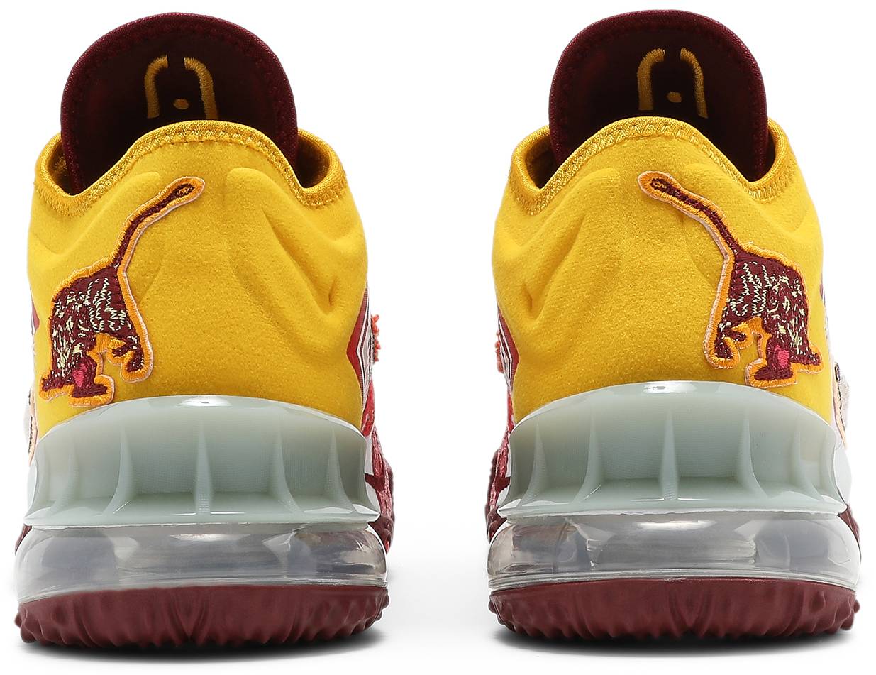 Dropping as the first installment of a four-part collection with the New York-based fashion designer, the Mimi Plange x Nike LeBron 18 Low ‘Higher Learning’ takes inspiration from a varsity jacket, an American wardrobe staple that symbolizes the intersection of school and sport. The sneaker makes use of a white textile upper with striped crimson accents and a fuzzy chenille Swoosh on the lateral side. An embroidered lion patch adorns the mustard-colored heel, while the medial quarter panel features smaller patches in keeping with the varsity sports theme. A graphic on the sockliner displays LeBron’s ‘Just a Kid from Akron’ tagline.