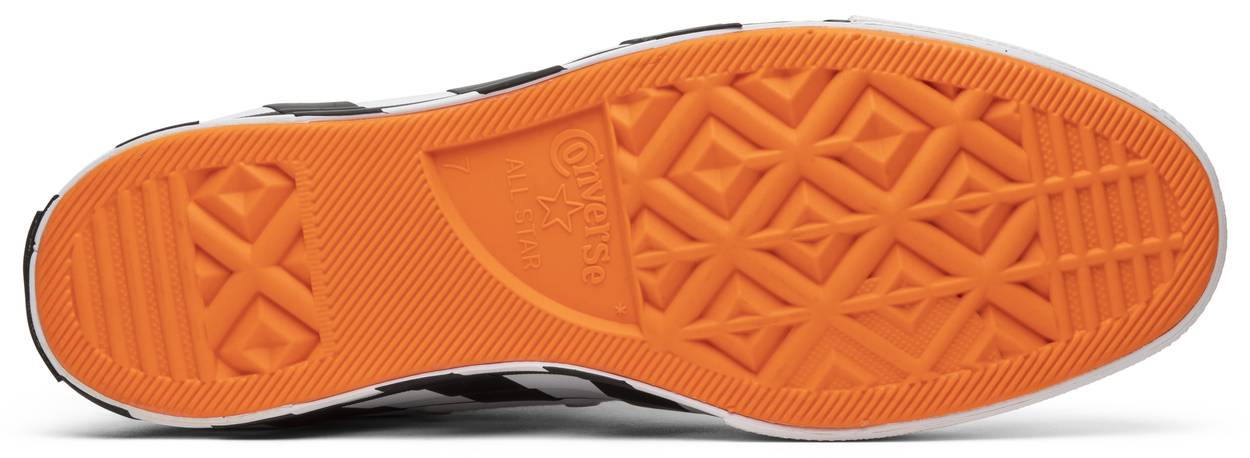 With the Off-White x Chuck 70 ‘White,’ Virgil Abloh places an emphasis on accessibility and wearability. Consequently, the iconic silhouette is dressed in conventional cotton canvas and finished in a versatile crisp white shade. Virgil even keeps the shoe’s signature and rubber license plate, though the latter is flipped upside down. Additional flourishes include the Off-White’s trademark diagonal stripes on the midsole, printed text on the medial side and a bright orange outsole.