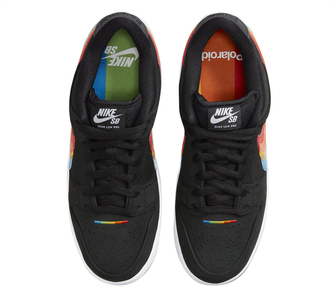The Polaroid x Nike SB Dunk Low pays homage to the iconic film and camera company. Boasting a bold, yet understated aesthetic, the low-top flaunts a black leather/nubuck upper with the highlight directed at the Rainbow Swooshes as a tribute to the Polaroid logo. Finishing touches consist of white appearing on the branded tongues, heels, and rubber sole, followed by co-branded laces tips and multicolored insoles to complete the makeup.