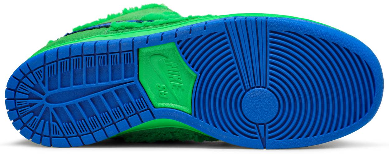 The Grateful Dead x Nike SB Dunk Low “Green Bear” is one of three extremely sought after colorways from the California based rock band’s collaboration with Nike SB. Nike SB produced a swarm of exciting new and original designs in 2020 that incorporate elements outside of the realm of sneaker culture, with the trio of Grateful Dead Dunks heading the lineup. The two-toned appearance of the upper features green faux fur on the toe, mid-panel, and heel as a direct reference to the band’s marching bears characters commonly seen on various artworks for Grateful Dead albums and merchandise. The motif reappears in a multicolor design on the insole. Tonal suede overlays dot the forefoot, eyelets, and heel. Branding appears in the form of a contrasting blue jagged Swoosh on the mid-panel, blue Nike embroidery on the heel, and a mini marching bear and Swoosh logo inside of an emblem on the tongue. One final detail of note, the hidden stash pocket located on the inside of the tongue displays the band's "Steal Your Face" skull.