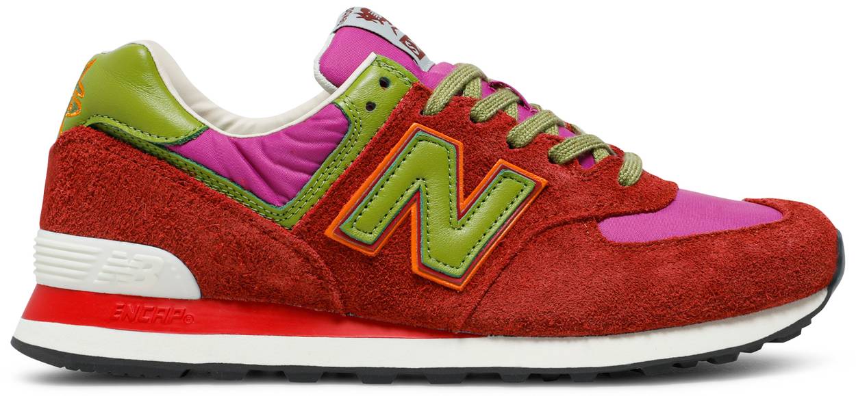 The Stray Rats x New Balance 574 ‘Red’ makes over the classic silhouette with a discordant mix of colors in keeping with the streetwear brand’s bold aesthetic. The upper combines a magenta nylon base with textured suede overlays in a brick red hue. Contrasting green hits make their way to the laces, ‘N’ logo and leather heel tab. The latter detail, along with the custom sockliner and woven tongue tag, displays Stray Rats branding. Lightweight cushioning arrives via an EVA midsole with a durable ENCAP rim.