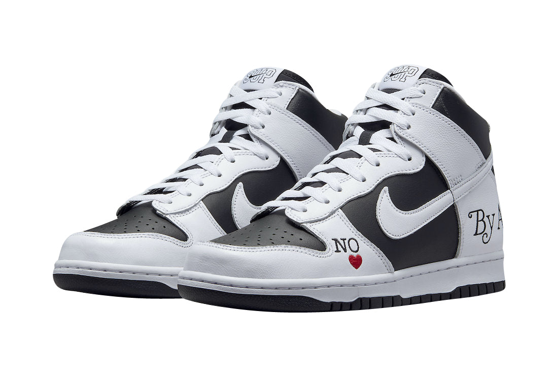 The Supreme x Nike Dunk High SB ‘By Any Means’ delivers a simple ‘Black White’ colorway of the classic silhouette, enlivened with design flourishes first seen on a New Era fitted cap from Supreme’s 2008 collection. The retro hoops shoe carries an all-leather upper in classic two-tone color blocking, highlighted by a solid black base with crisp white overlays. Crimson accents are integrated into a ‘No Love’ graphic on the lateral forefoot, along with wraparound heel embroidery that reads ‘By Any Means.’ Less conspicuous branding hits take the form of ‘SUP’ tongue tags and ‘Supreme Team’ script at the back of the collar. Inside the shoe, a red sockliner displays dual Supreme and Nike SB branding.
