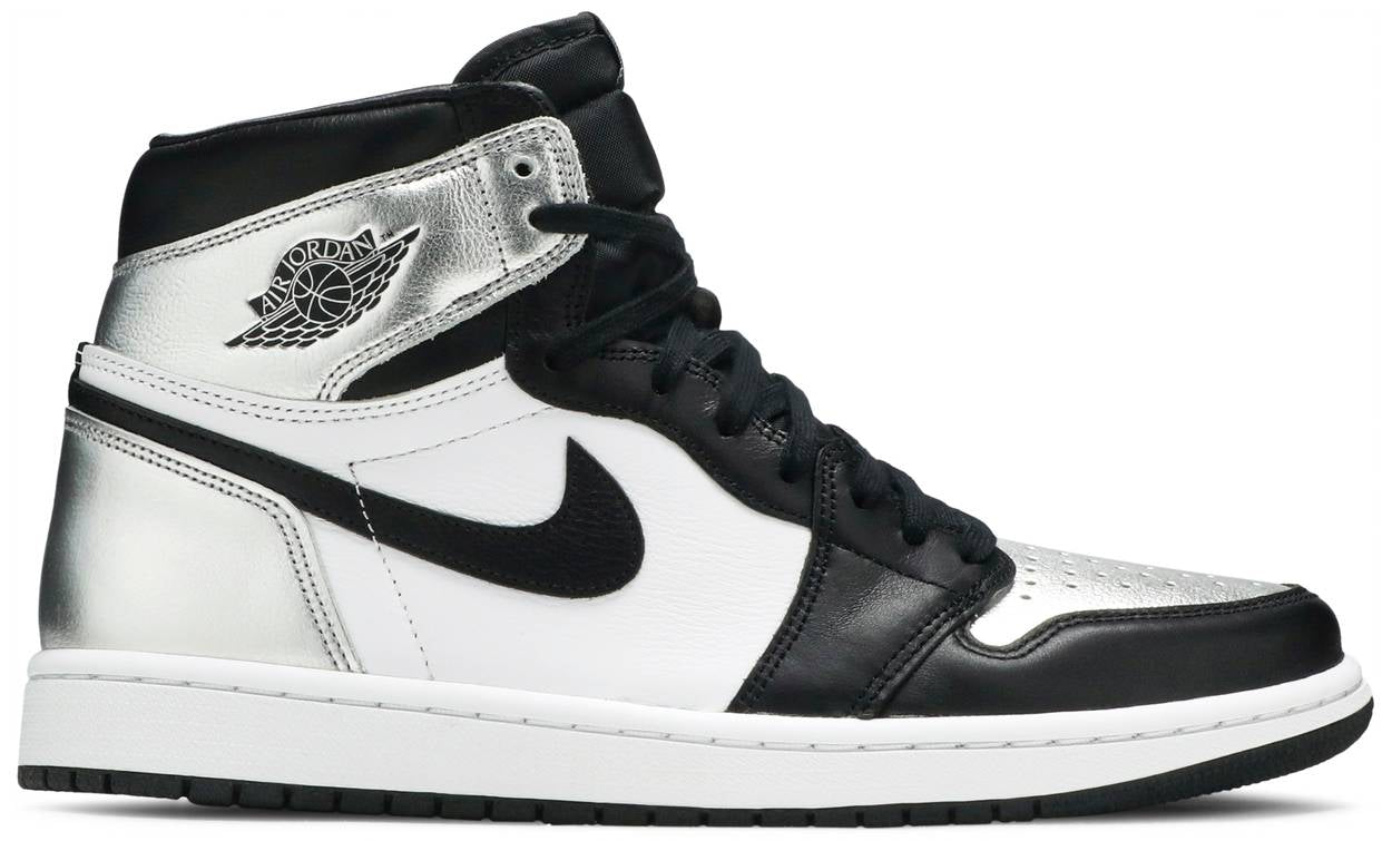 The women’s Air Jordan 1 Retro High OG ‘Silver Toe’ adopts color blocking that recalls the Air Jordan 1 ‘Gold Toe’ from 2018. This pair discards the patent leather build of the older shoe in favor of a standard leather upper, featuring a clean white base with contrasting black forefoot overlays. A shiny metallic silver finish distinguishes the toe box, heel panel and collar flap, the latter stamped with a Jordan Wings logo on the lateral side. Additional branding elements include a black leather Swoosh and a woven Nike tag atop the nylon tongue.