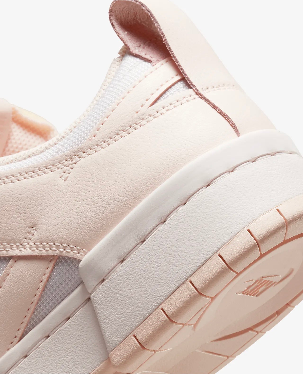 The Nike women’s Dunk Low Disrupt ‘Pale Coral’ adds pastel hues to a reimagined version of the classic silhouette. The two-tone upper is crafted from breathable white mesh with leather overlays in a soft pink hue. A plush exposed-foam tongue delivers step-in comfort, while a leather pull tab at the heel provides easy on and off. The sneaker is mounted on an exaggerated platform midsole with segmented sidewalls. Underfoot, the rubber outsole features a modified concentric-circle traction pattern for optimal grip.
