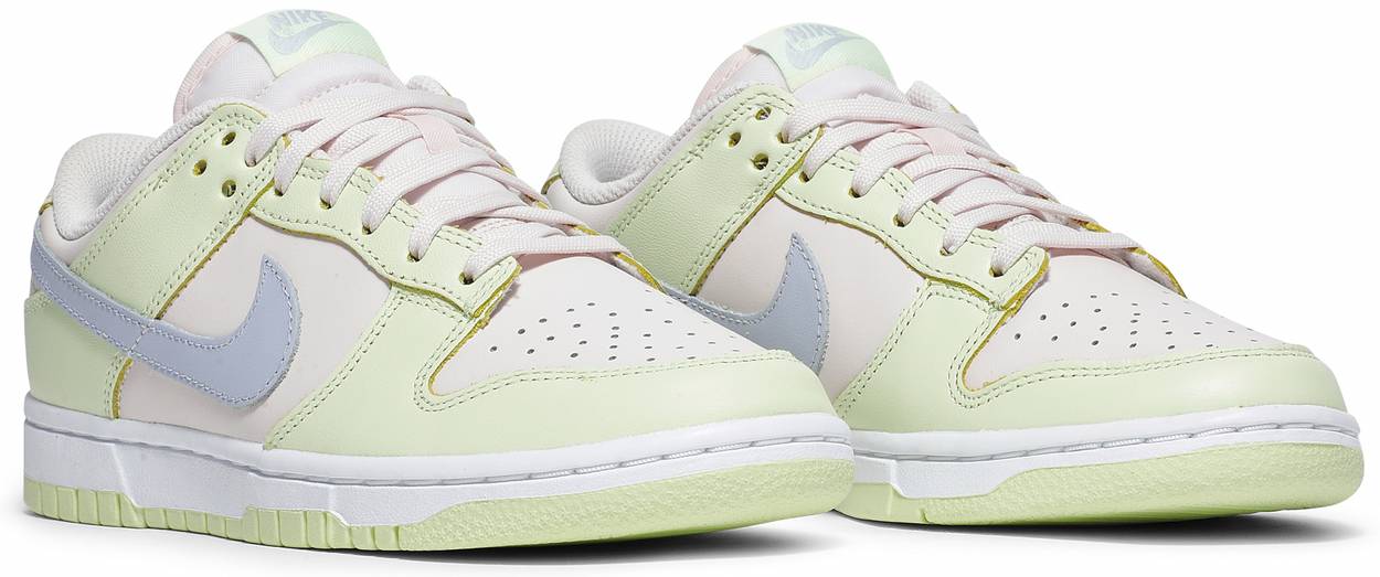 The Nike women’s Dunk Low ‘Lime Ice’ updates the ‘80s hoops shoe with a summery palette made up of contrasting pastel hues. The leather upper combines a muted pink base with vibrant lime green overlays and a signature Swoosh in periwinkle. Standard Dunk Low elements include a perforated toe box, low-cut textile-lined collar and lightly padded nylon tongue. The sneaker is mounted on a sturdy rubber cupsole, featuring crisp white sidewalls and a lime green rubber outsole.