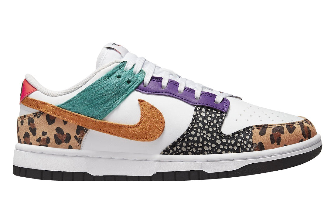 A perfect look for the spring/summer season, this Nike Dunk Low starts off with a White leather upper topped off with the mix of colors, prints, textures and patterns on the overlays. Some of the defining features include the leopard, faux furs, safari, and even the suede used on the mismatched Swooshes. Completing the look is the White on the tongue, laces, lining atop a Black rubber outsole. An extra set of Black laces, Red leather heel tab and Red Swoosh branding on the White tongue tag complete the look.