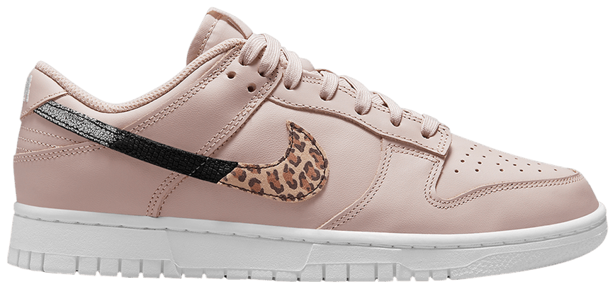 This exact style has emerged with a dusty pink leather upper and the same three-pronged logo that features leopard spots at the hook, reptilian finishes in the middle, and a cracked elephant skin on the tail end. Much like the all-white and black/white versions that were shown before, this Dunk Low also features a solid white midsole and outsole combination, providing a clean platform for these made-for-lifestyle options. Matching laces and tongue labels continue the monochromatic appeal, while a white contrast is utilized on the tongue logo and heel text.