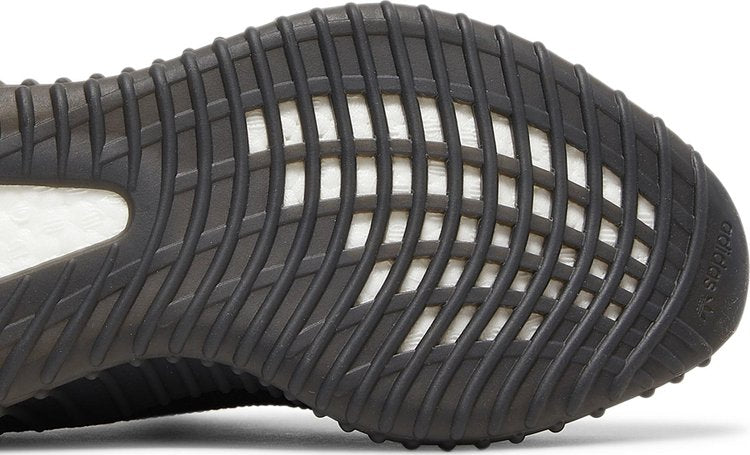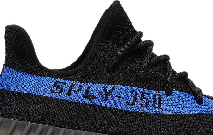 The adidas Yeezy 350 V2 Dazzling Blue is reminiscent of the 2016 Yeezy 350 V2 Black Friday Pack. Instead of featuring a marbled pattern and sheer side stripe, it opts for a solid black Primeknit upper and blue side stripe with "SPLY-350" text. At the base, a muted Boost sole offers comfort and support.